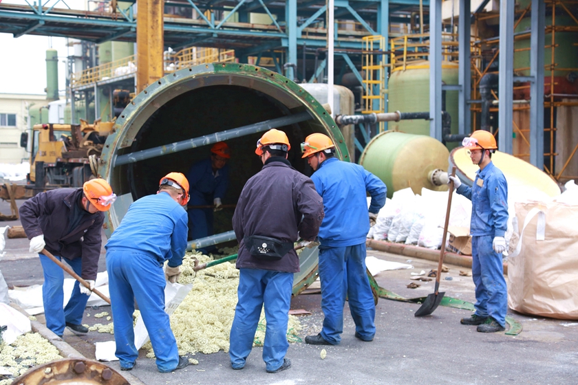 四是撸起袖子加油干。公司坚持现场环保处理到位,整个大修期间做到无气味、无污染。氯厂一改往年对于系统中无法排尽底液和管道里的积液的处理方式,采取将酸接到桶里以防进入雨水系统,剩余无法正常排出的底液硫酸,就人工一勺一勺舀出来,虽然消耗了更多的时间和精力,但是舀酸的过程就是对全厂员工环保意识警示。2T501塔虽然经过清洗置换,但里面的填料需要员工戴上长管式防毒面具进入塔内进行掏挖,时间一长就会透不过气来,但大家不分岗位全体出动、轮流上阵,用手一把一把给挖出来、捧出来。