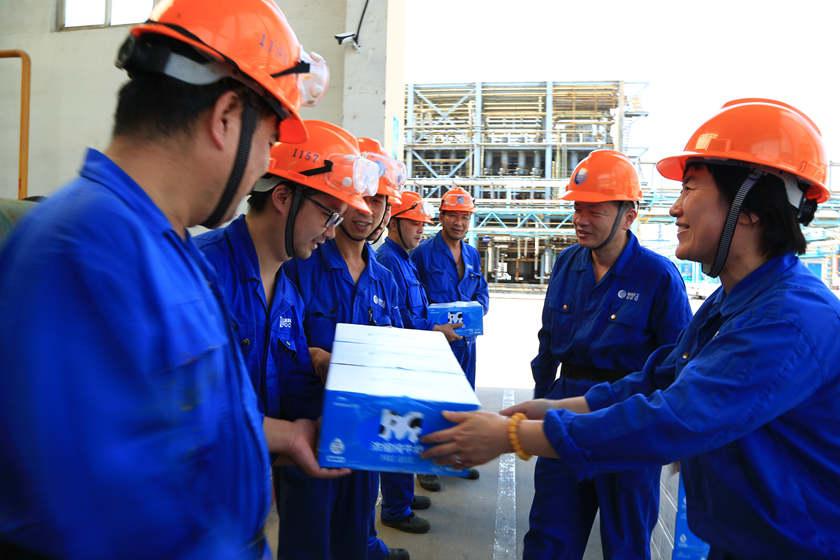当天上午,公司党委副书记、纪委书记、工会主席邬优红,总经理助理汪静带领相关人员先后来到了液氯充装站、氯蜡操作室、ECH项目施工现场等处,为高温下坚守岗位的一线员工和施工人员送去了柠檬茶、雪碧、牛奶等防暑降温物品,并向他们表示亲切地慰问和诚挚地感谢。“天气炎热,一定要注意安全,合理安排室外作业时间。”每到一处,公司都提醒大家要注意做好防暑工作。在ECH项目施工现场,公司还仔细查看了施工人员的工作环境,详细询问了现场高温作业的防护措施,并反复叮嘱大家在抓施工进度的同时,也要保重好身体,劳逸结合。